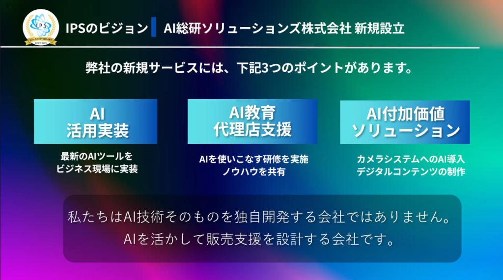 また、本ウェビナーでは今後の取り組みとして、新規に設立いたしましたIPSのグループ会社「AI総研ソリューションズ株式会社」をご紹介しました。