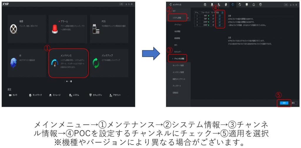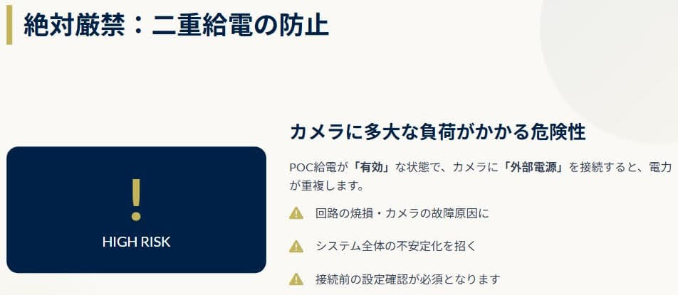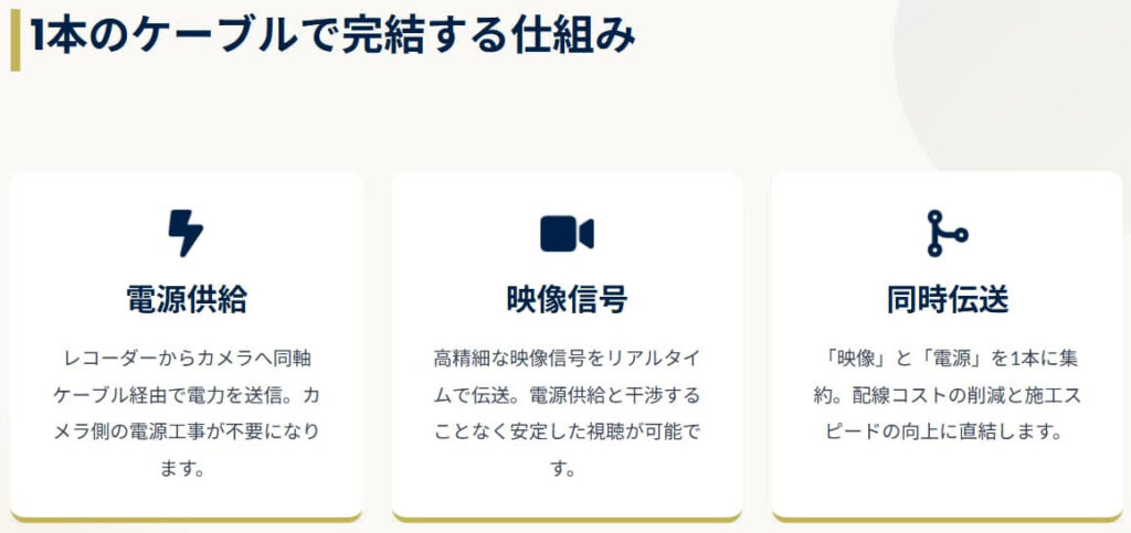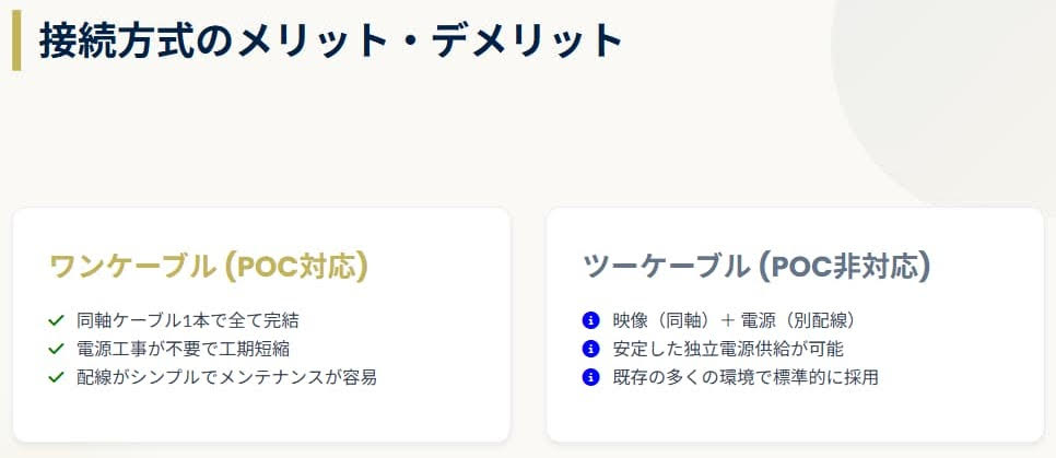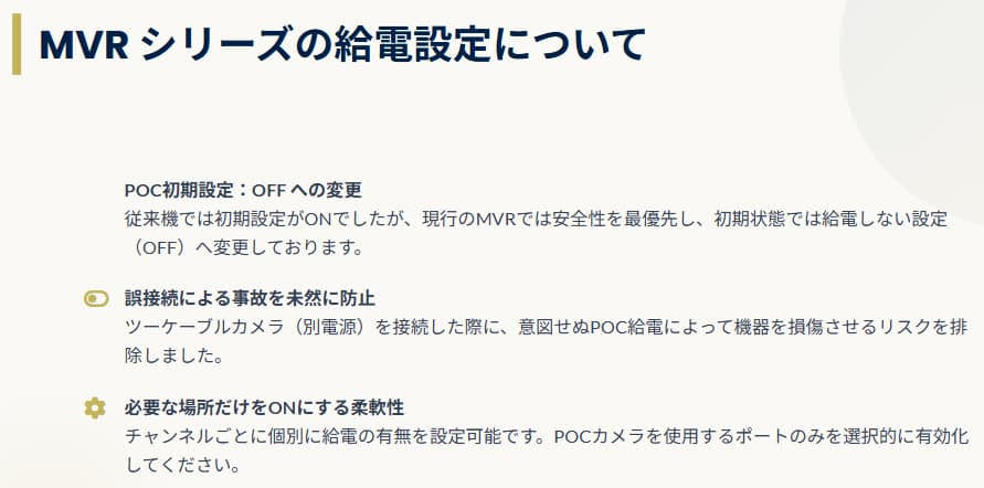 「POC(Power over Coaxial)」の基礎と、最新MVRの給電設定 2026.04.01 ■ POCとは?■ カメラ接続方式の比較■ 導入時の重要な注意点■ 最新MVRの仕様変更■ POC設定変更手順について>HOME