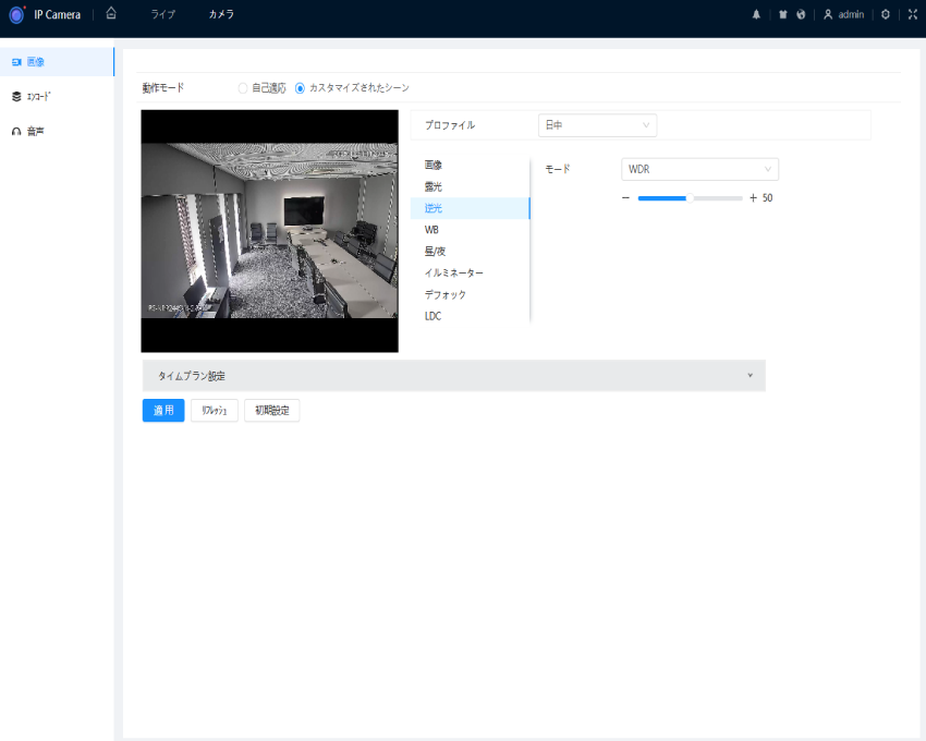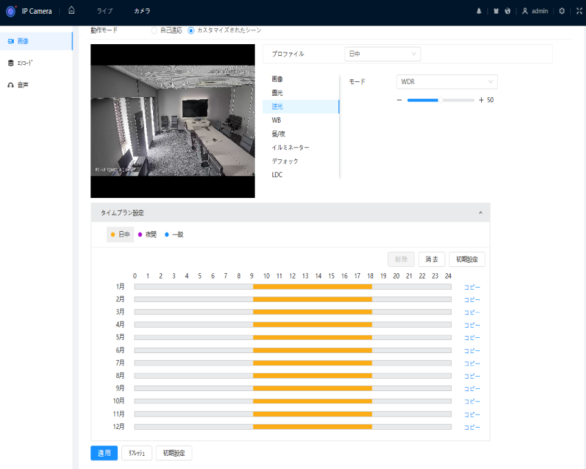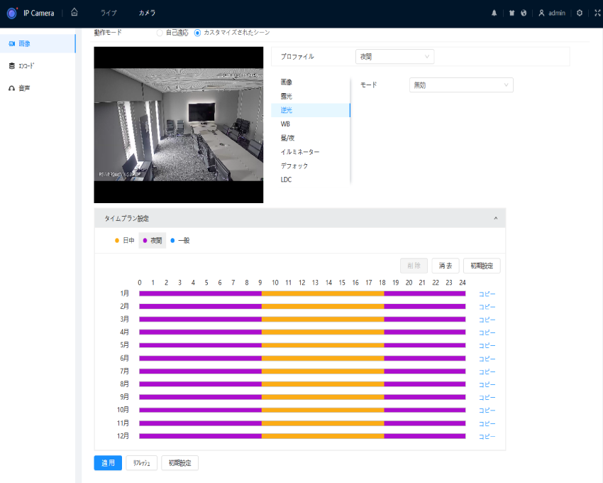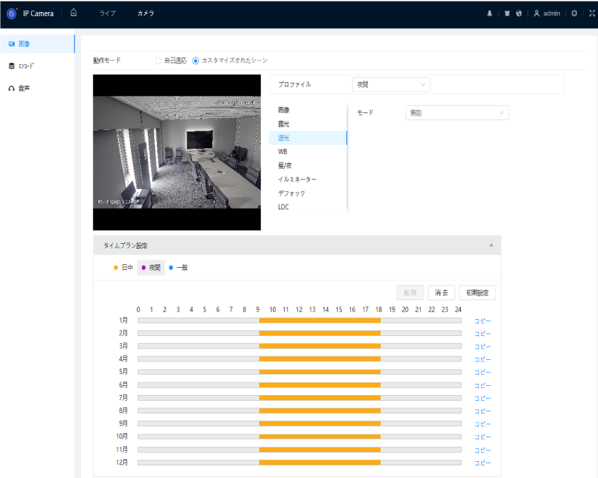 夜間は逆光補正をオフにするといったスケジュール設定を行うことで、 昼間も夜間も最適な映像を維持することができます。